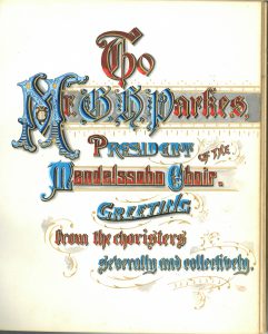 During the 1909-1910 season, the Choir undertook a concert tour to Buffalo and Cleveland. The over 200 choristers later expressed their great appreciation – in the most flowery terms – for the care and attention to detail taken by the Choir President Mr. G. H. Parkes (who was also a tenor in the Choir) on this tour. This presentation letter, illuminated by Edith Emily Shaw, was presented in February 1910.