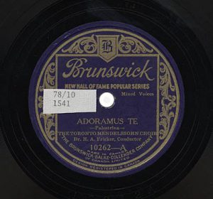 You can still listen to TMC’s very first 1926 recording of Palestrina’s Adoramus Te, uploaded by Library and Archives Canada. Listen below or visit Library and Archives Canada’s Virtual Gramophone.
