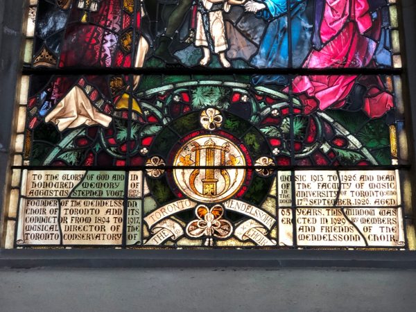 Dr. Augustus Vogt, founder of the TMC, died in 1926. In April 1929 a stained glass window to his memory was unveiled in St. Paul’s Bloor Street.